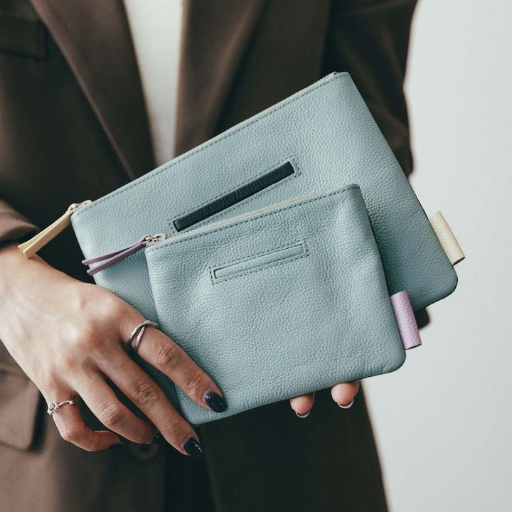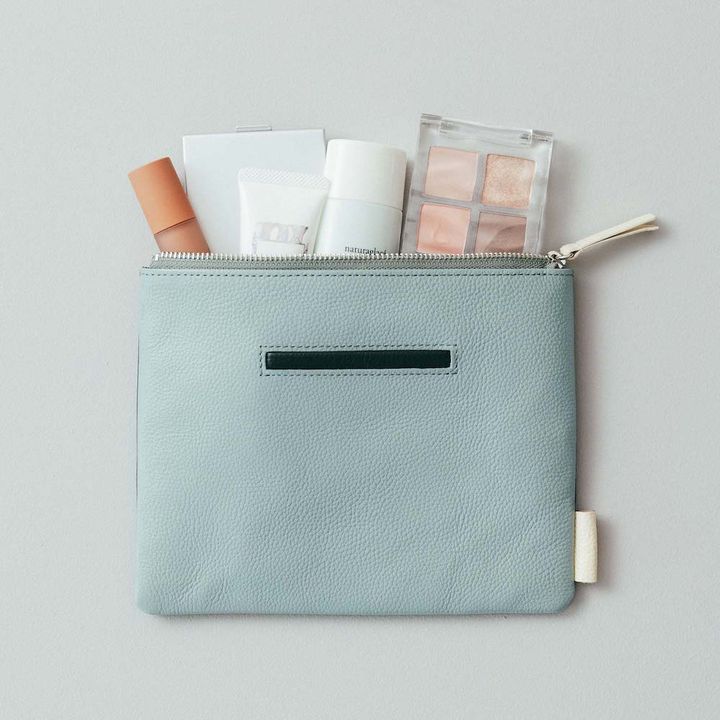 バッグに入れてもかさばらないフラットな形状の「フラットレザーポーチ」はSとMの2サイズ。Sサイズはメイク道具や、散らばりがちな小物などを入れるのに最適。
