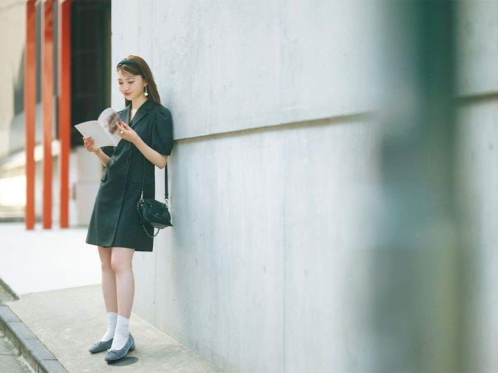 ワンピース¥17,600/31Sons de mode(ヒロタ) バッグ¥13,750/ダイアナ(ダイアナ 銀座本店) バッグ¥2,990/UNIQLO カチューシャ¥22,000/アレクサンドル ドゥ パリ(アレクサンドル ドゥ パリ GINZASIX店) イヤリング¥4,400/マチルダローズ リング¥24,500/エルぺ ヴィ ジヴィル(ロードス) ソックス¥770/ドット フクスケ(福助)