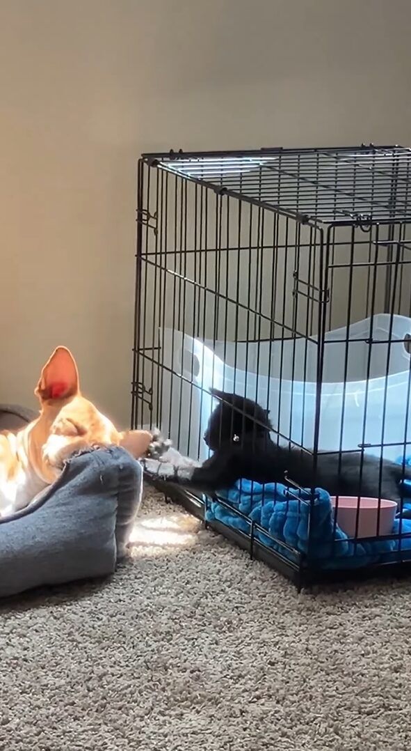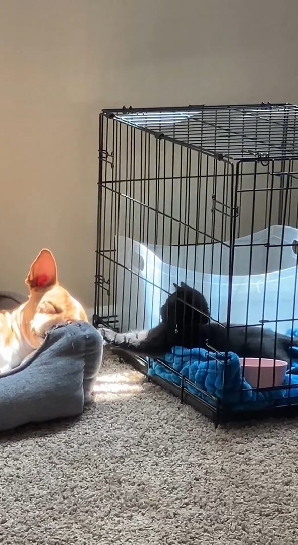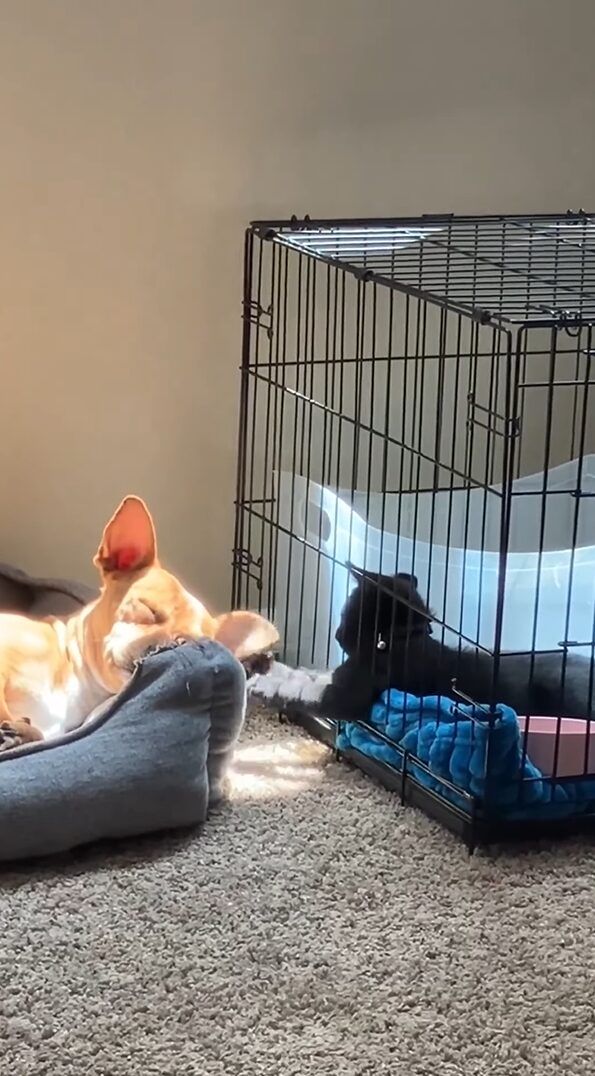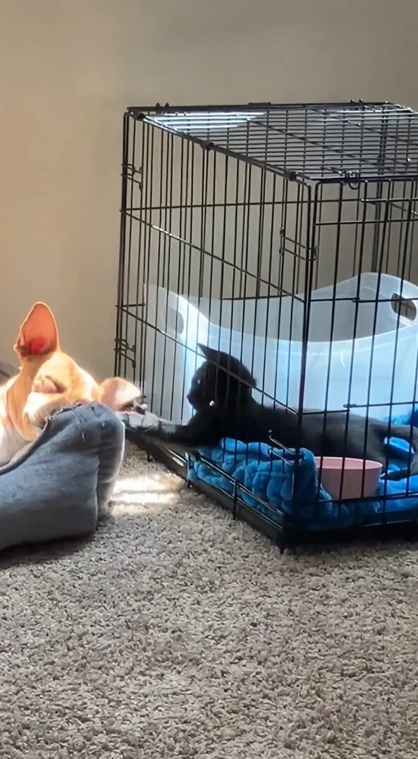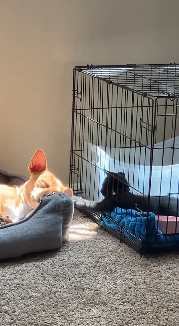 ケージの中にいるネコと、その隣でお昼寝をするイヌ。 ネコはケージの隙間からおててを伸ばして、イヌの耳を触り始めました!