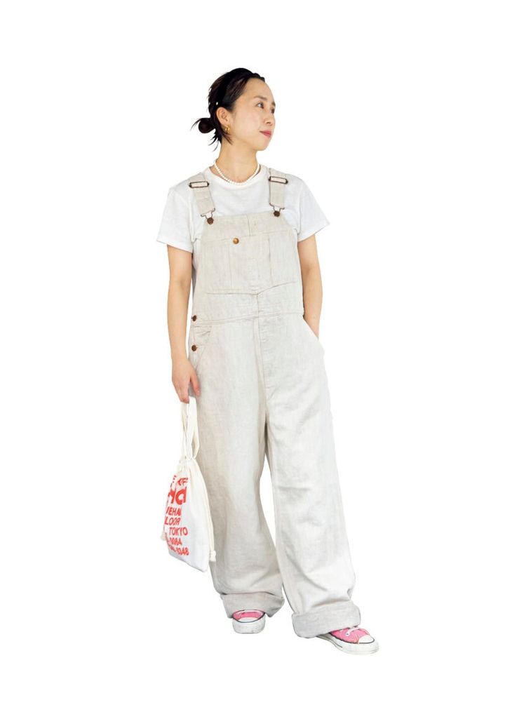 「Tシャツ×オールインワンは子どもっぽくなりそうですが、ワントーンにすることで大人っぽくこなれた印象に仕上がります。パールのネックレスやカチューシャで女らしさを、ピンクのスニーカーで遊び心を足すなど単調にならないように小物で変化をつけます」Tシャツ¥7,700、オールインワン¥43,780、バッグ¥3,960(すべてオブラダ)、カチューシャ¥10,450(イリスフォーセブン)、パールネックレス¥42,900(カドー/すべてシンチ)