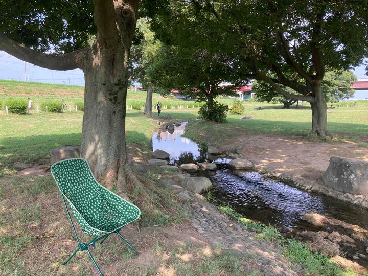 河川敷をサイクリングしながら、ちょうどよさそうな大きな木を見つけたので、さっそく木陰に椅子をセッティングしました。