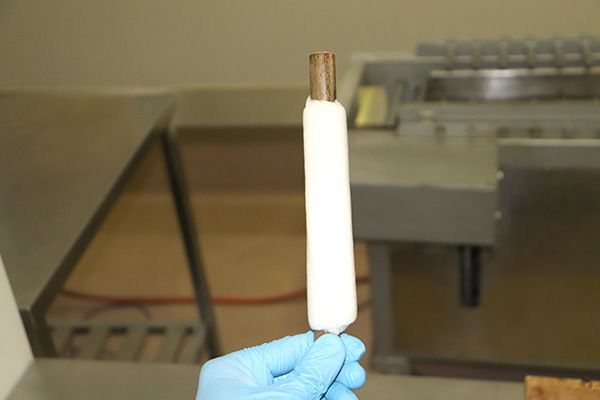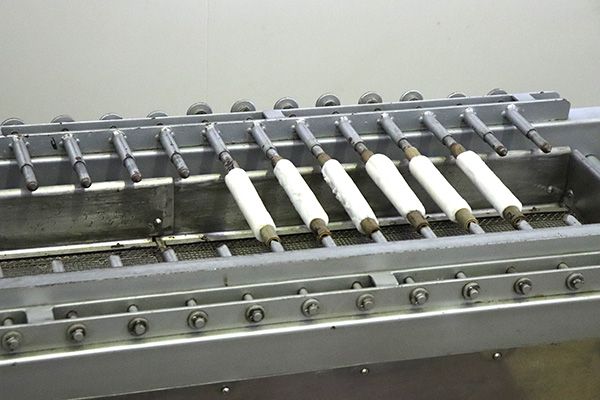工場の中に入るのってワクワクしますよね! スタッフの方の説明をよく聞いて、まずちくわから作っていきます。 ちくわ用の棒が1人1本用意していただけるので、シート状になったすり身を棒に巻きつけていき…