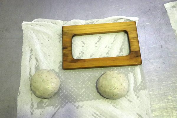 次はじゃこ天作りを体験。 じゃこ天用の型の真ん中に、すり身の塊を置いて、手で押しながら型の両端まで伸ばしていきます。