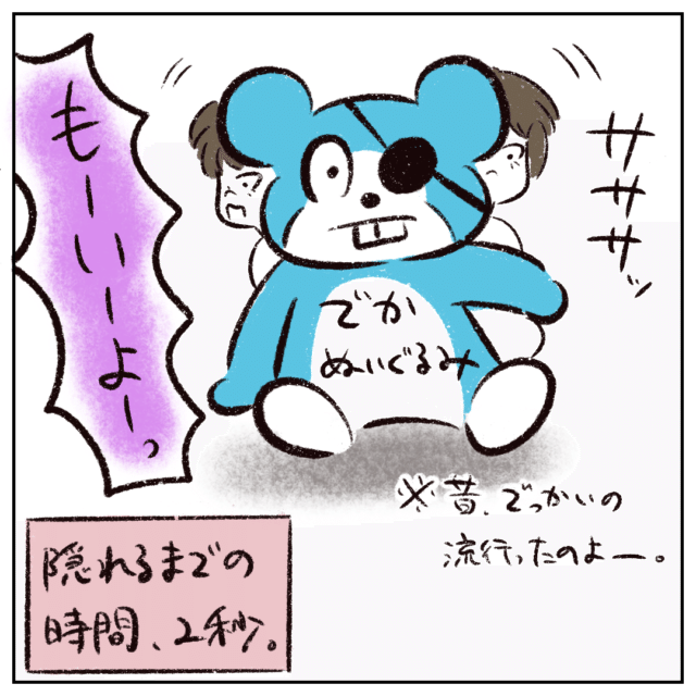 その後で、「もーいーよーっ!」大きなぬいぐるみの後ろに隠れた後、まるさんに声をかけました。60秒を超えるほどまるさんに数えさせたにもかかわらず、ぬいぐるみの後ろに隠れるのにかかった時間は約2秒。