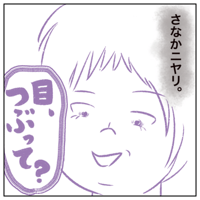 まるさんの家でかくれんぼをすることになり、まるさんを鬼に指名したさなかちゃん、「目をつぶって?」と言われ、言われるままに目をとじたまるさんを見てニヤリとしました。