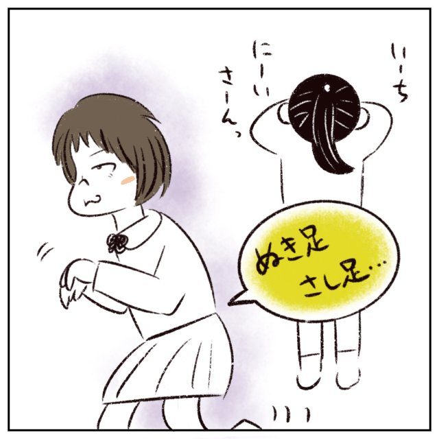 そして「いーち、にーい、さーんっ・・」目をとじて1から数え始めたまるさんを見て、ぬき足さし足とこそこそと歩き出すさなかちゃん。