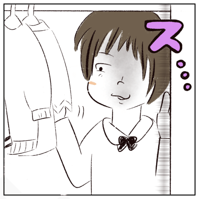 そして、さなかちゃんはまたクローゼットにやってきて、ハンガーにかかっている洋服を物色します。