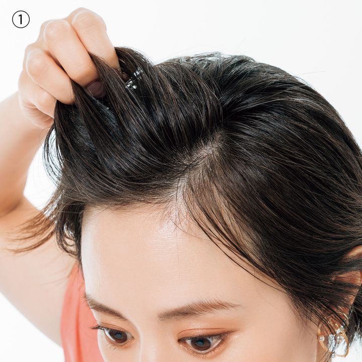 ①根元にヘアミストを吹きかけて、ぱっきり割れてつぶれた分け目を消すように揉み込みながらなじませて、根元からふんわりさせます。前髪は黒目の上くらいの位置で分けて、ワックスで束感を作ります。