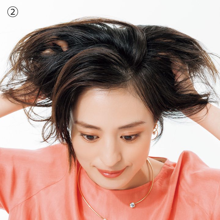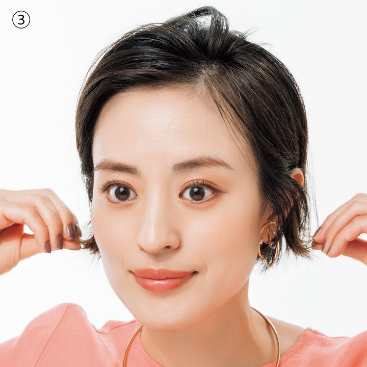 ③トップはふんわりと立ち上げて、サイドは耳にかけてスッキリまとめたら、衿足部分は、耳の下で束感を出しながら外ハネにします。毛先が寝グセでハネてしまっていても直す必要なしの無造作ヘアが完成。