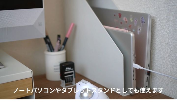 タブレットを立てかけて充電ケーブルを差せば、簡易的なスタンドに早変わり。必要な書類と一緒にひとまとめにしておけば、欲しいときにさっと取り出して情報を確認できそうです。