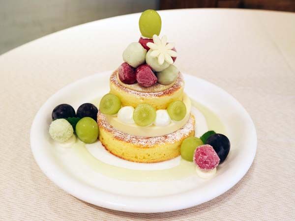 しっかりとしたもっちり食感のボリューミーなパンケーキに、果実感の強いアイスの実とフレッシュフルーツをどう組み合わせるか試行錯誤を重ねた結果、誕生したこのひと皿。「アイスの実<ぶどうマスカット>」を1袋(12粒)をぜいたくに使用しています。アイスの実のジューシーなぶどうの味わいが楽しめるように、マスカルポーネのアイスムースがパンケーキの間に挟まっていて、甘さすっきりのカスタードクリームが層のようになっています。
