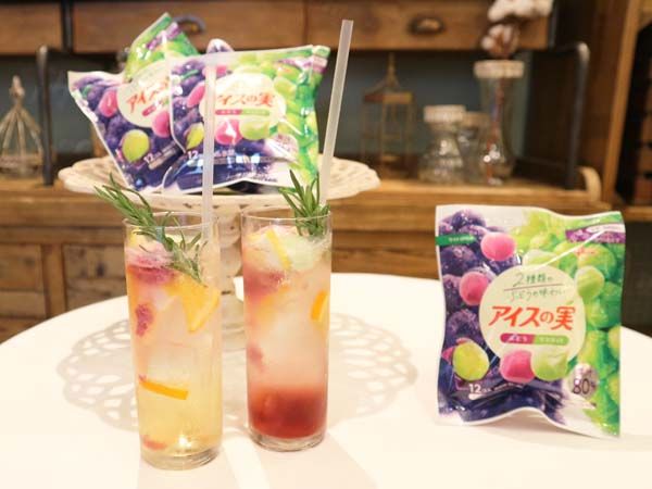 カフェ アクイーユ恵比寿では、ホームパーティーにもおすすめの「アイスの実(R)ぶどうマスカットのソーダ」の開発も。「アイスの実<ぶどうマスカット>」のぶどう・マスカットを各2粒を、ぶどうジュースと炭酸水1:1(各70ml)にイン。好みでオレンジやグレープフルーツ、ローズマリーなどをプラスするとSNS映えも! おうちで簡単に楽しめる華やかなドリンクは、気分もアップしそうです。