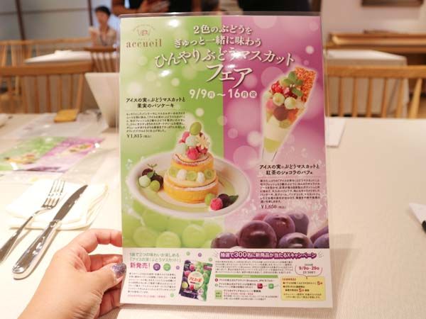 パティシエが作るパンケーキが人気のカフェ アクイーユ恵比寿では、9月16日(月・祝)までの期間限定で「2色のぶどうをぎゅっと一緒に味わう ひんやりぶどうマスカットフェア」を開催! 「アイスの実<ぶどうマスカット>」を使った限定スイーツが、食べられます。
