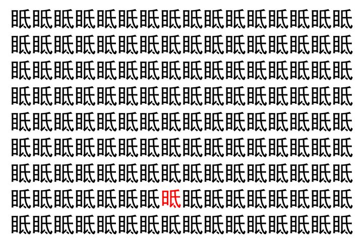 画像の中には、「眡」という漢字が縦に9行、横に16個並んでいます。 全部で144個となりますが・・・、そのうち1つは「異なる漢字」となってますよ!!