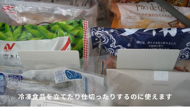 ブックエンドは冷蔵庫の中でも活用できます。冷蔵室のドリンクや、冷凍室の冷凍食品の仕切りにすれば、写真のようにどこに何が入っているかわかりやすい状態になりますね。