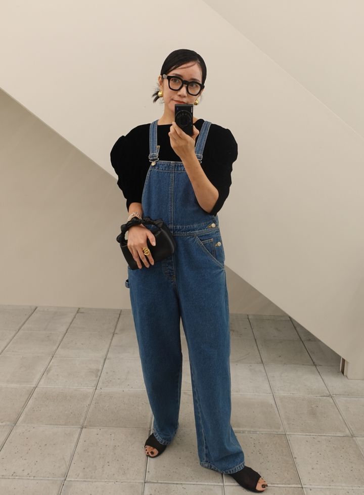 大人が真似したい、ミニマルなサロペットの着こなしはチェック必須。「デニムのサロペットにベロアのトップスを合わせることでカジュアルになり過ぎない大人のコーディネートに。小物を黒でまとめたのもポイントです」