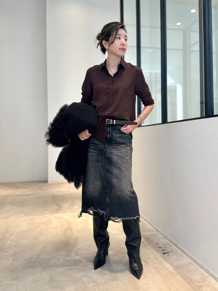 大胆なクラッシュディティールが目をひくスカートを女っぽい着こなしへ。「タフなデニムスカートはシルクの上質なシャツとロングブーツでレディライクに合わせるのがポイント。ボリュームのあるロングブーツと、気になっていたボルドーカラーを取り入れて今年らしいスタイリングにしました」