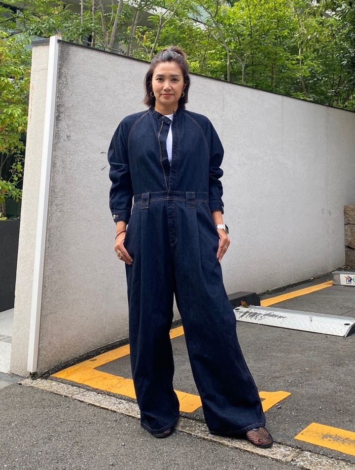 履かなくなったデニムを再利用したサステナブルなデニムのジャンプスーツ。「ダメージ加工などが施されていない、デニムのジャンプスーツです。まだまだ暑いので、フロントのジップをあけています」