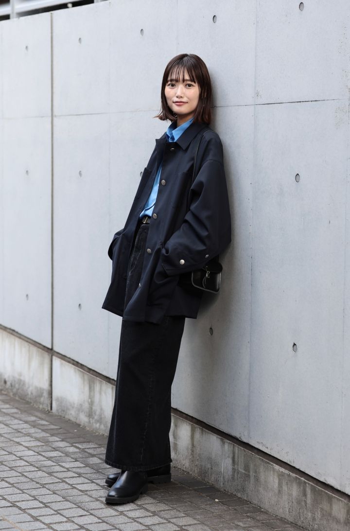 スッキリ見えるシルエットが魅力的な坪田あさみさんとのコラボスカートをメインに大人なスカートコーデ。「ブラックデニムのスカートを主役に、ブルーのシャツをアクセントにしてメンズライクにスタイリングしました」