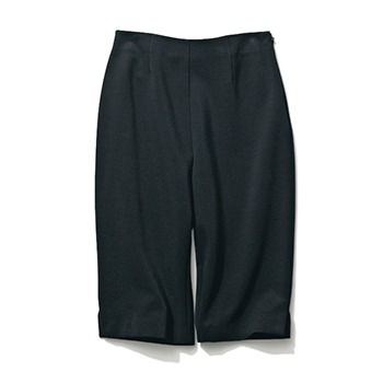 黒ハーフパンツ/SEA(エスストア) 丈を短くすることで、地厚ながら快適に。ミニマルだからよくあるショートパンツより意外と大人。秋からは上はニットやアウターなど厚みを持たせ、下は細身のハーフパンツで軽快に仕上げたり、ブーツにも好相性。
