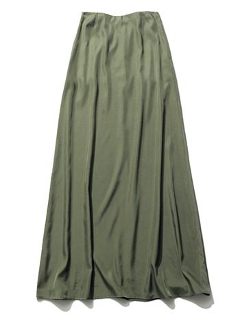 カーキフレアスカート/ReNAVE(NAVE) ウールやニット、スウェットなどこれからのトップスやアウターにぴったり似合うサテンの上質な光沢と優美な揺れ感。ともするとドレッシーな1着は、無骨なカーキでカジュアルダウン。