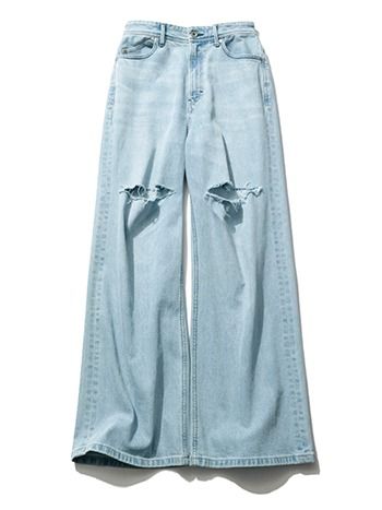 ダメージデニムパンツ/KAORI HIGUCHI×YANUK (カイタックインターナショナル) 秋からのキレイめなアウターやリブニットにも相性がいい、淡いブルーのワイドデニム。色ムラも少なく、清潔感も残せる。