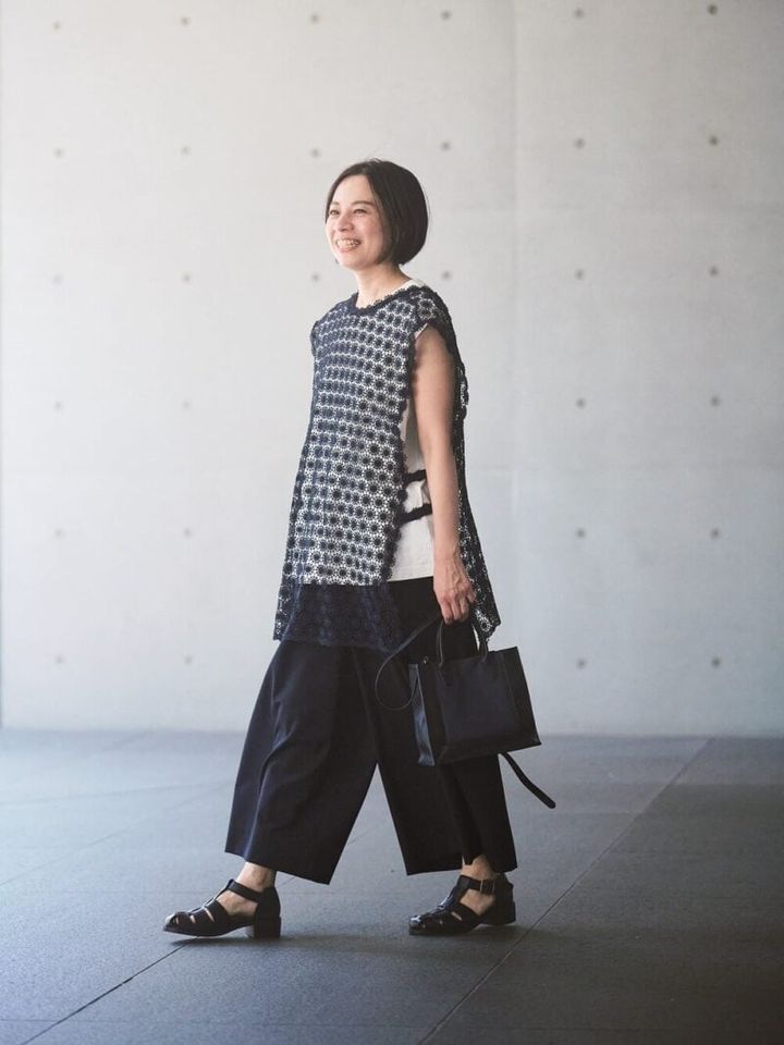 コーディネートの主役は、ダークネイビーのレースベスト。「オリジナルモチーフのケミカルレースがキュートなので、ほかのアイテムをシックなものでそろえてきれいめコーデを意識しました」