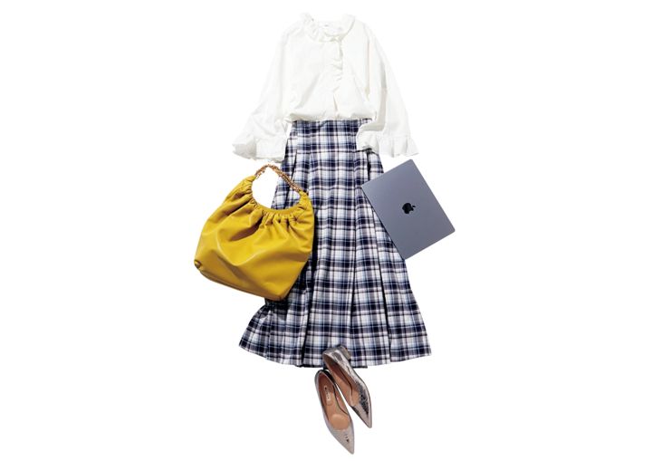 フリルブラウス¥20,790/APEL チェックスカート¥15,400/MERCURIDUO(MERCURYDUO ルミネエスト新宿店) シルバーパンプス¥16,500/ダイアナ(ダイアナ 銀座本店) チェーンバッグ¥16,940/ミラ オーウェン ルミネ新宿2店