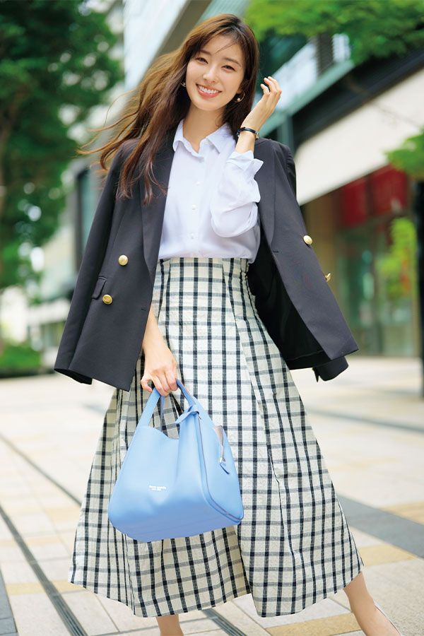 シャツ¥2,990/UNIQLO ジャケット¥24,200/ジャスグリッティー スカート¥16,500/Noëla バッグ¥57,200/ケイト・スペード ニューヨーク(ケイト・スペー ド カスタマーサービス) 腕時計¥79,200/ヴァンドーム青山(ヴァンドーム青山本店) イヤリング¥6,820/イットアトリエ(14 SHOWROOM) パンプス¥31,900/銀座かねまつ (銀座かねまつ6丁目本店)