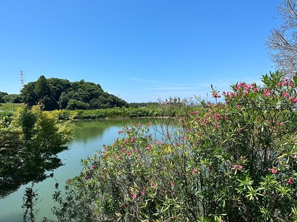 駐車場はお店の前とドックランの横に20台分あります。お店の前の駐車場の横は池と木々が美しく輝いていました。