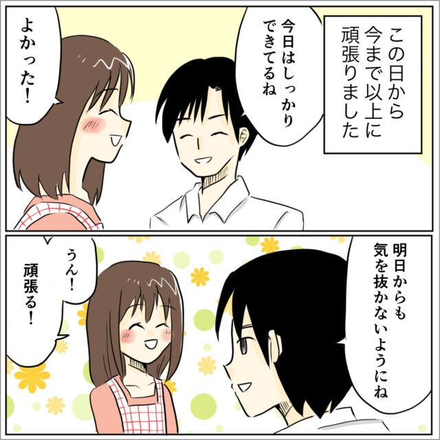 「ユウコの代わりができるの?」と夫に言われ「頑張る」と宣言してから、私はそれまで以上に頑張りました。毎日チェックする夫も「今日はしっかりできてるね」と満足そう。「明日からも気を抜かないようにね」と言われ、「うん!頑張る!」とやる気が出ました。