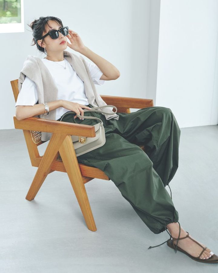 昼夜の寒暖差が出てきたこの時季、半袖ではひんやりしてしまう夜も…。そんなときはスウェットを取り入れて昼は肩がけ、夜は重ねて着こなすと便利。「白T×パラシュートパンツ」のメンズライクなワンツーコーデも、スウェットのひと手間でマイルドに仕上がります。足元やバッグで女性らしさを加えて、抜け感を意識するのがコツ。