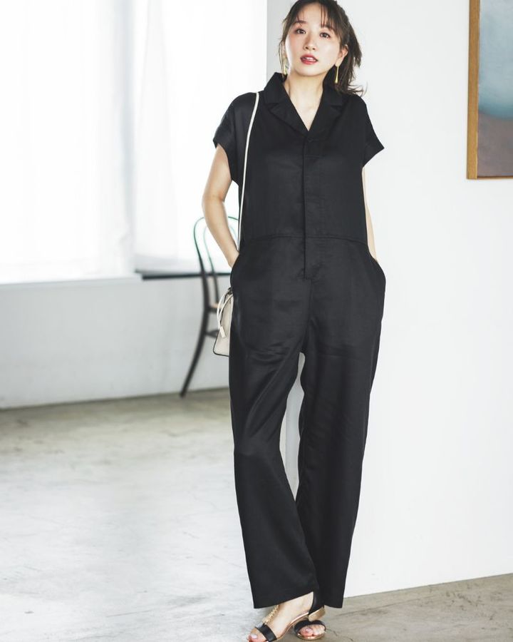ワンピースやスカートなどのフェミニン要素が苦手な人でも、大人カッコよく着こなせるのが「ジャンプスーツ」。お仕事はもちろん退勤後のディナーまでカバーするなら、ドレッシーな黒がおすすめ。ハリ感素材を選ぶとほっこり見えせず、着るだけでサマになります。仕上げにミニバッグや華奢サンダルを合わせてレディなムードをひとさし。