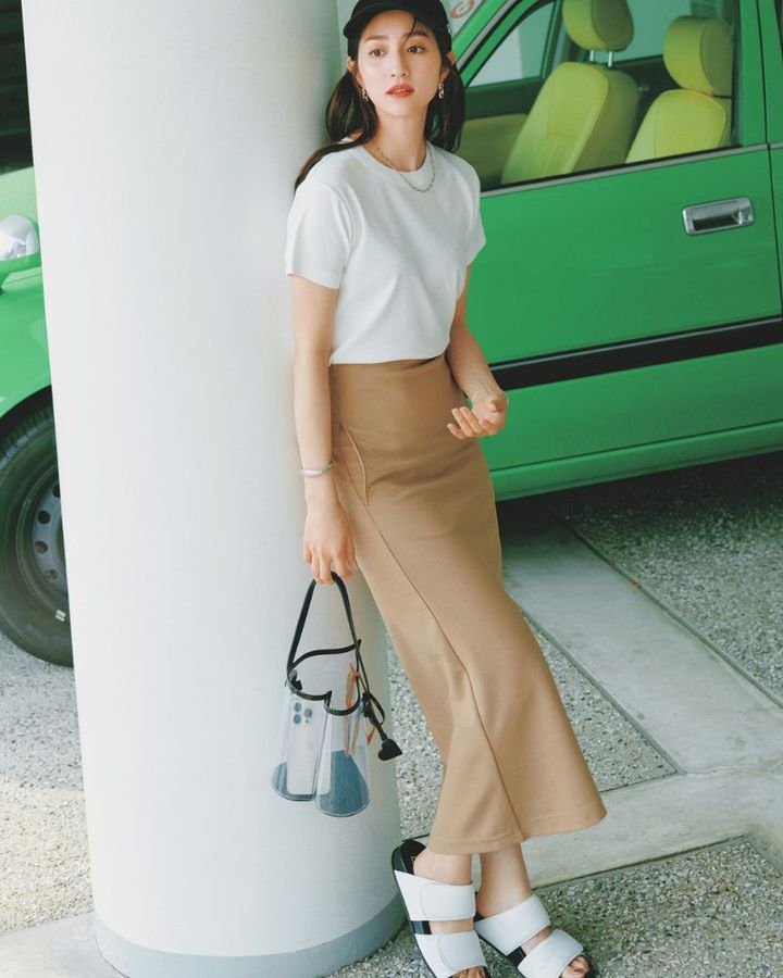 ベーシック派の本命「白Tシャツ」は、地味に見えないよう小物使いで緩急をつけるのがコツ。ペンシルスカートを合わせた真面目なワンツーコーデには、キャップやクリアバッグ、サンダルなどのスポーティ要素を加えたハズしテクが効果的です。ラフになりすぎないよう、華奢なジュエリーを合わせて大人の品格をキープすると好バランスに。