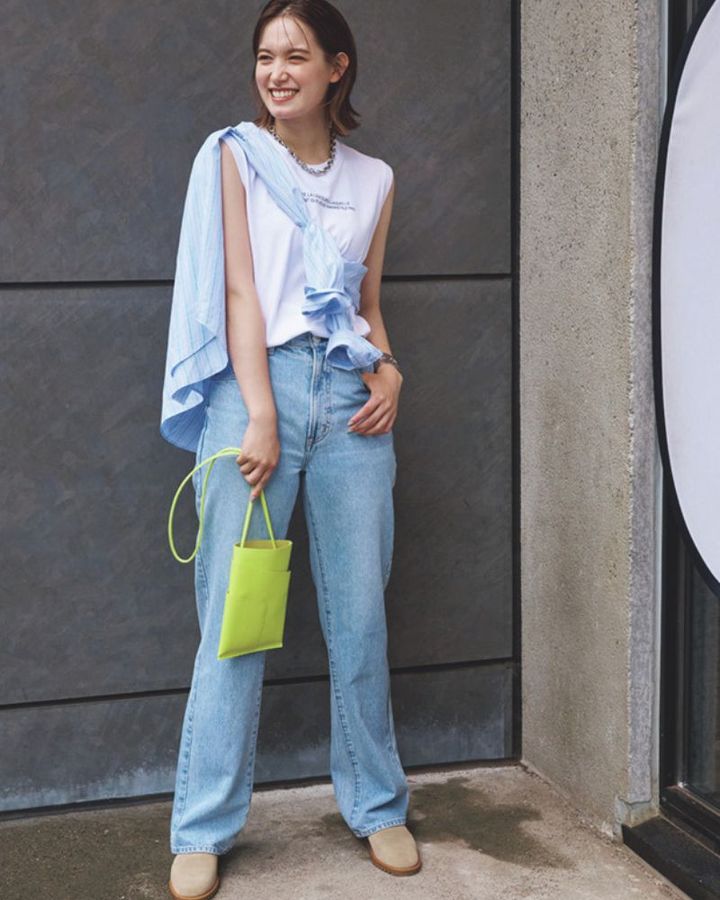 大人のデート服は、スカートやキャミソールで女性らしさを狙うより、ヘルシーな肌見せで高感度を上げるのが気分。ノースリカットソーならTシャツの親しみやすさも取り入れつつ、嫌味のない色気が備わります。シャツを斜めがけしてアクセサリー感覚で取り入れれば、この時季の気温にも対応。薄色デニムとシャツをワントーンで繋いで、上級者の装いに仕上げて。