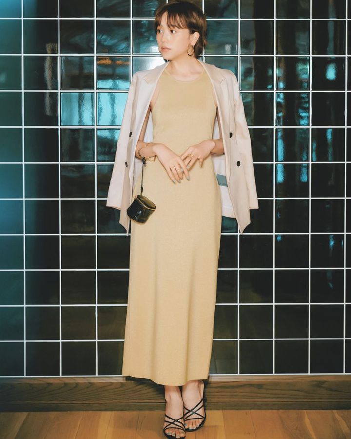 トレンドのアメスリは洒落っ気あるディテールですが、カジュアル見えする一面も…。ビジネスシーンで着るなら、大人っぽさが際立つベージュを選んでリュクスに装って。肌なじみがよいので、露出が悪目立ちしません。さらに同系色のジャケットを肩がけするひと工夫で、アメスリ特有の肩回りの肌見せを上品に演出して。