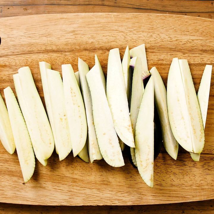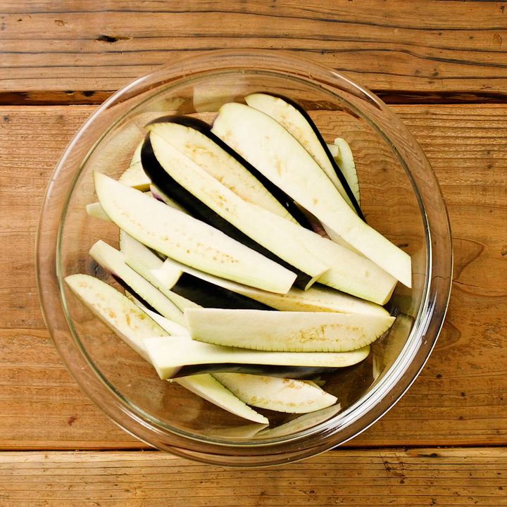 1: なすのへたを落とし、縦半分に切ります。皮目に細かく切り込みを入れてから、さらに縦3〜4等分に切ります。