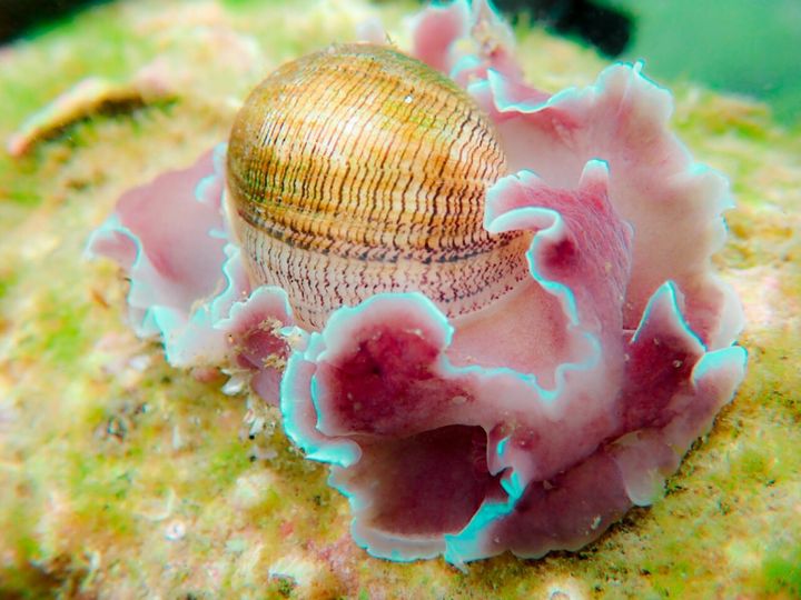 「御簾貝(みすがい)」は、ウミウシの仲間。 ウミウシの多くは、貝が退化していますが、「御簾貝」は例外的にはっきりと巻貝を背負っているのが確認できます。