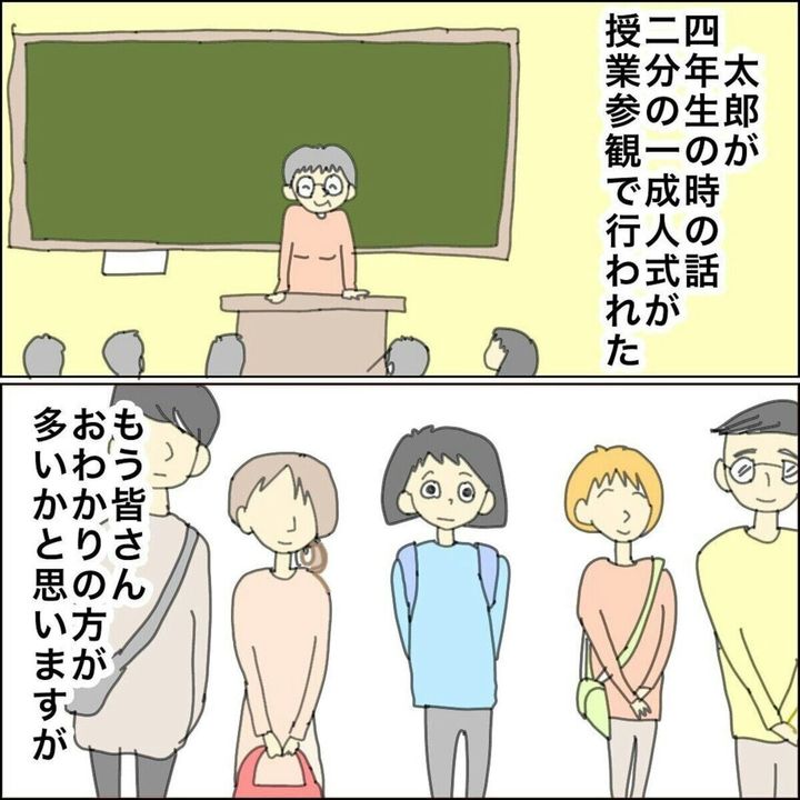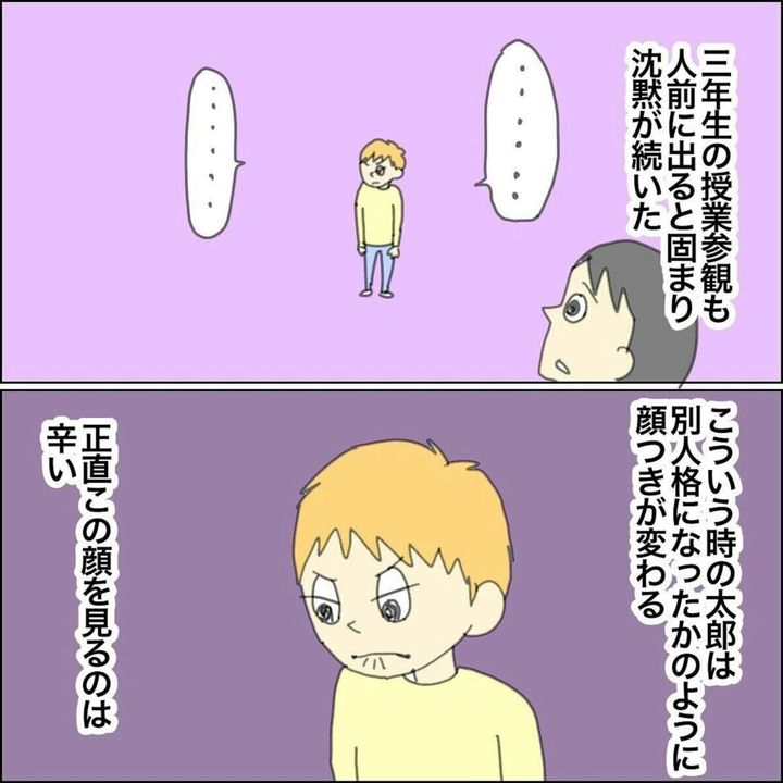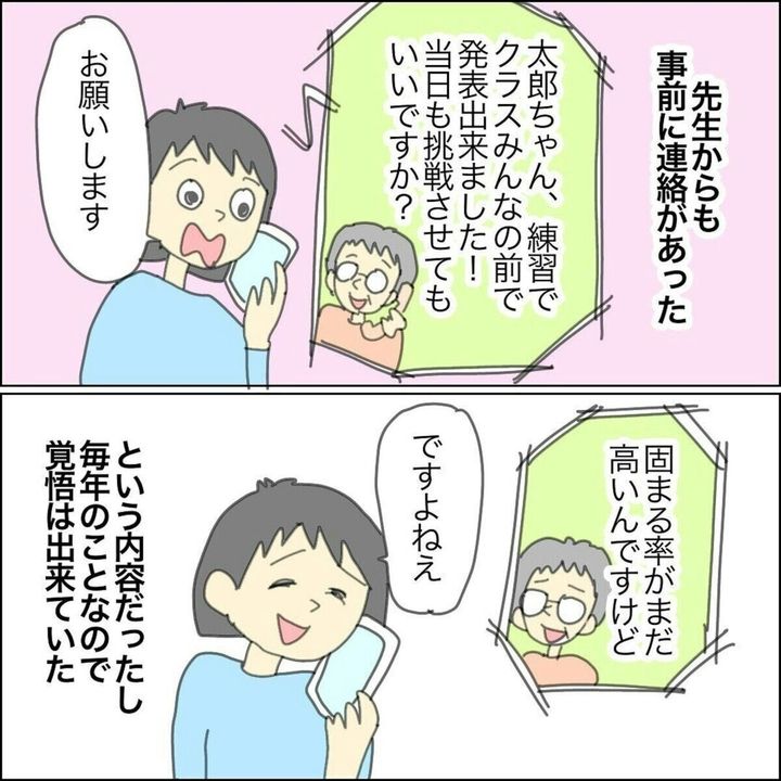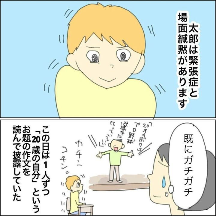 授業参観で二分の一成人を行い「20歳の自分」というテーマでそれぞれが書いた作文を発表することに。しかし、太郎くんには場面緘黙があり、発表は容易なことではありませんでした。まだ順番ではないのにも関わらず緊張している様子の太郎くんを見て思わず心配になったまゆんさん。事前に先生から「練習でクラスメイトの前ではできた」という話を聞いていたものの、固まるのは毎年のことと覚悟はしていました。