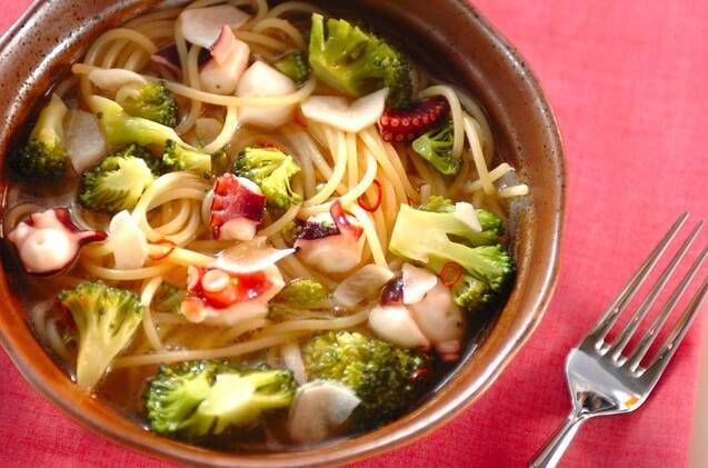 ガーリックをたっぷり使ったスープ仕立てのパスタです。栄養価が高い「ブロッコリー」と「タコ」を加え食べ応えアップを狙います。副菜には、食物繊維とビタミンが豊富な「セロリ」のサラダをチョイス。栄養があるセロリの葉もぜひ一緒に食べてくださいね。