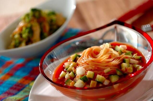 「トマトジュース」で作る簡単なカッペリーニは野菜をふんだんに使って食べ応えと噛み応え、そして栄養価をアップします。付け合わせは、低カロリーの「鶏むね肉」を使ったスタミナ満点のガーリック炒めをセレクト。タンパク質も忘れずに、バランスよく摂取しましょう。