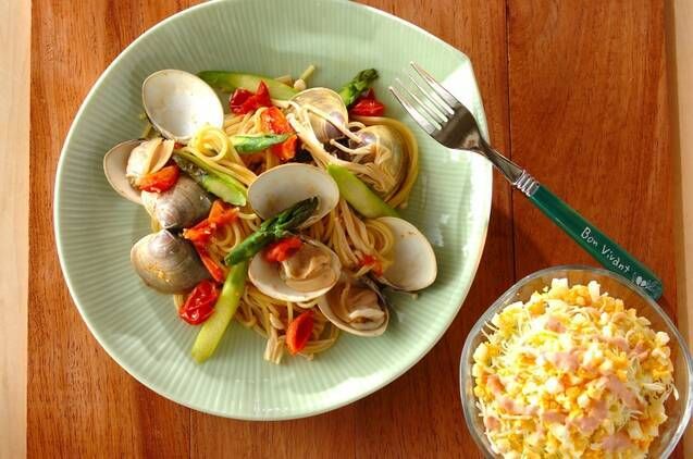 ハマグリの凝縮した旨みが染み込んだ食べ応えのあるパスタは、スパゲティーの量を少なめにし、エノキを混ぜてカロリーダウンしています。シャキシャキ食感のコールスローサラダはよく噛んで食べましょう。しっかり噛むことで満腹感が得られます。