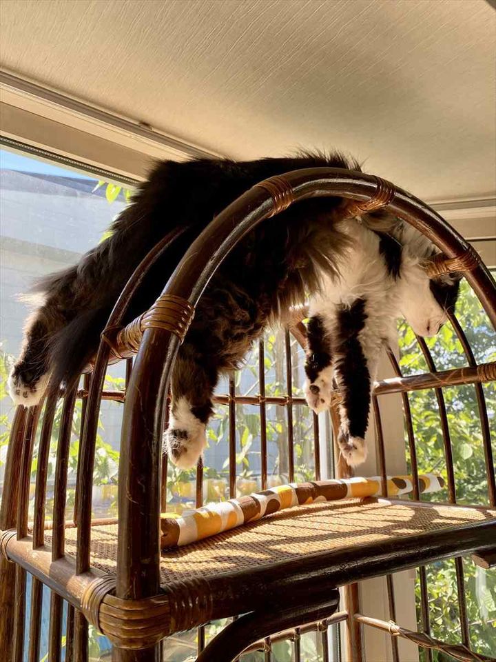 その時、あわせちゃんがいたのは飾り棚のアーチ状の部分の上。 体を伸ばし、手足もだらんと宙に浮かせてひなたぼっこをしています。