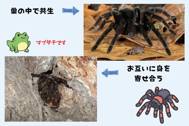 中には巣穴の中でタランチュラとカエルが身を寄せ合っている姿まで見つかったのです。