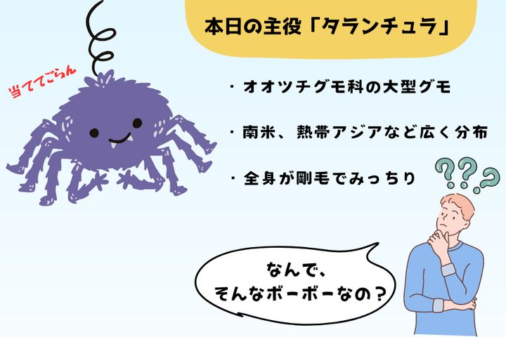 「タランチュラ」とはオオツチグモ科に属するクモの一般的な名称であり、南米や熱帯アジア、オーストラリアなど世界に広く分布しています。