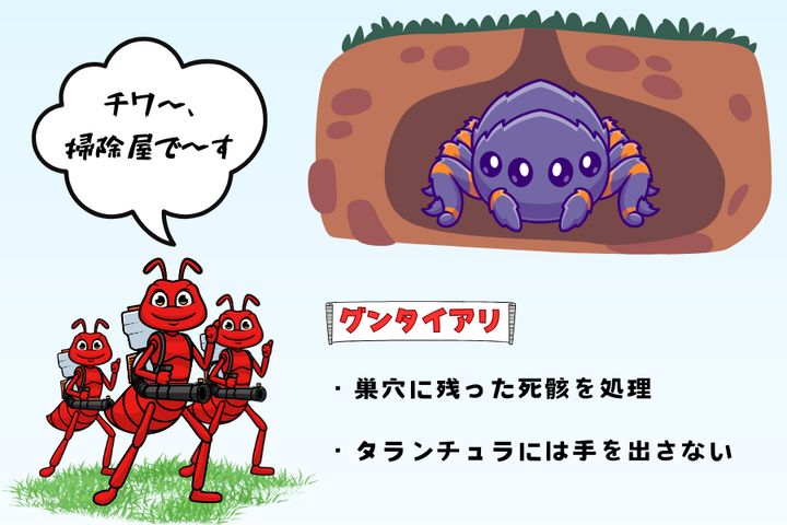 これは巣穴を清潔に保つことにも有益であるため、タランチュラにとってグンタイアリは便利な掃除屋となっていました。