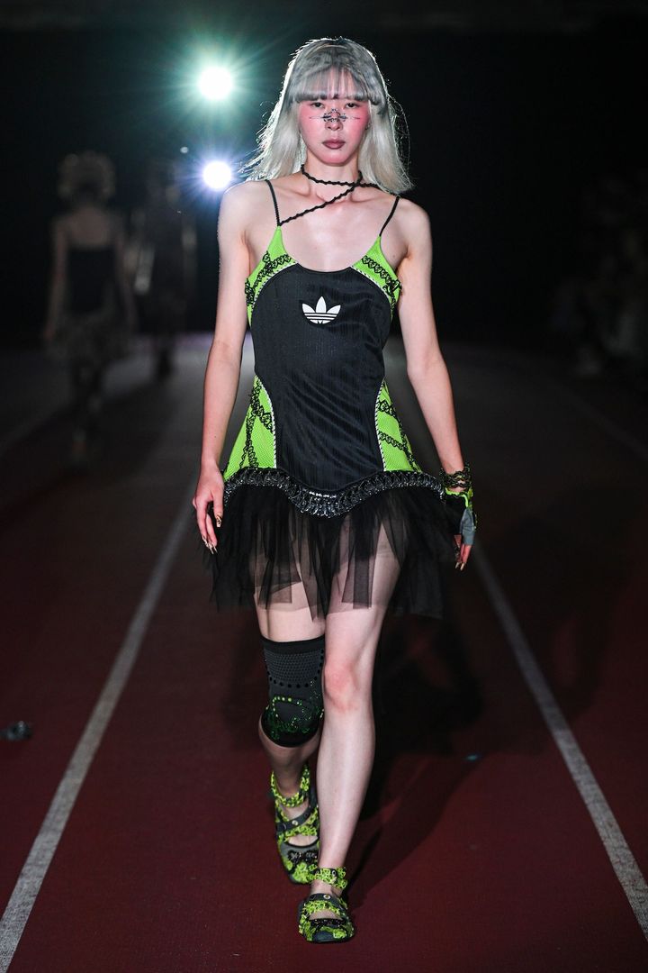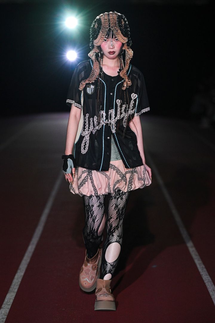 ショー会場は国立競技場内駐車場にある一線に伸びるトラックスペースで、真っ赤に染まるライティングから明るい光へと色を変え、躍動感ある音楽と共にショーはスタートした。ファーストルックはシースルーのユニフォームをメインに、レースやリボン、ブランドが得意とするチェーンデザインを用いたヘアアクセサリーに彩られ、シースルーなどの素材感で軽やかさを感じさせながらも、刺繍や複雑なレイヤードで幻想的なムードを表現する。よく見るとハート型のレースの中には、漢字で「愛」と象られており、細かなデザインからユェチ・チが大切にしている手工芸の技術力が垣間見える。