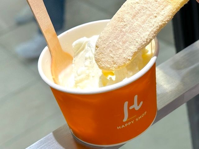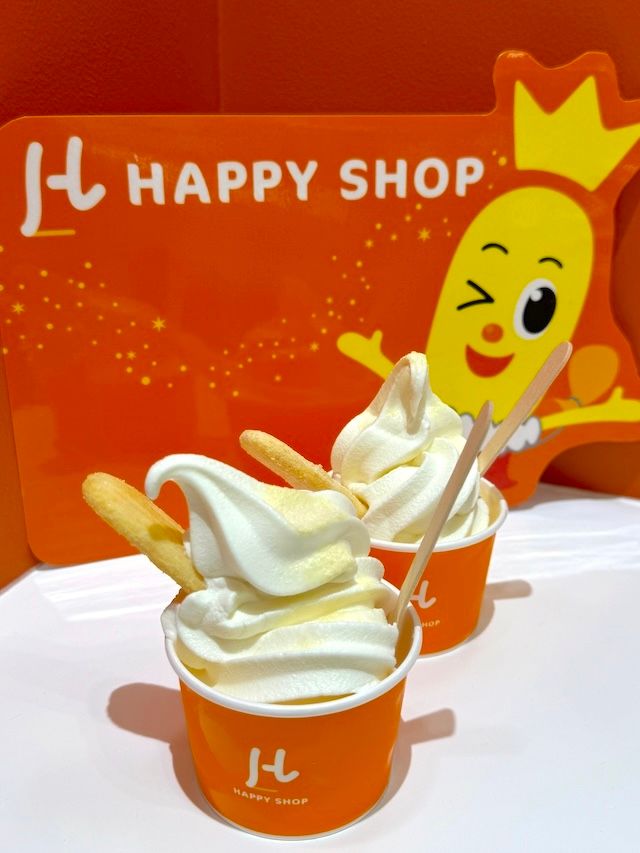 お土産だけではなく、イートインも必見! 先ほどご紹介した「HAPPY SHOP」では、できたてのハッピーターンを食べられるだけでなく、ハッピーターンのパウダーがかかったソフトクリームも販売中! できたてのハッピーターンは揚げたてのハッピーターンにパウダーを目の前でまぶしてくださり、アツアツをいただけます。ソフトクリームは、濃厚なミルクソフトの上に罪な味のハッピーターンパウダーをたっぷり。そこに揚げたてのハッピーターンが添えられた新感覚スイーツ!