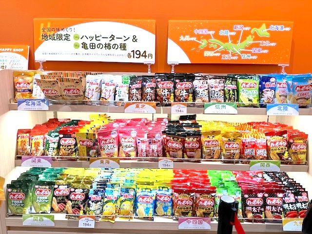 新潟といえば、米どころ。新潟の食品メーカー・亀田製菓グループのアジカルの商品がずらっと並んだ「HAPPY SHOP」は必見! こちらで驚いたのは、全国のハッピーターン・柿の種のご当地フレーバーがズラリと並んでいること! ご当地フレーバーは旅の記念の醍醐味ですが、なんとこちらを訪れるだけで全国制覇も可能!? (すべてのフレーバーがそろっている訳ではありません)こんな味があるんだ……! と興味を掻き立てられます。