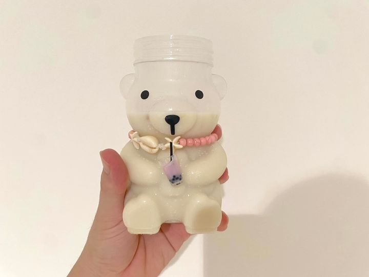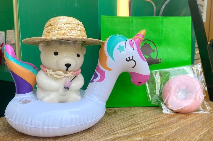「ANAKUMA CAFE原宿店」のすべてのドリンクは、注文時に追加料金でボトルをクマの形をしたクマボトルに変更できます。クマボトルは定番の「制服クマボトル」プラス1200円と季節限定ボトルの2~3種類展開。今回は取材時に提供されていた、浮き輪がついた「夏クマボトル」プラス1200円をセレクトしました。